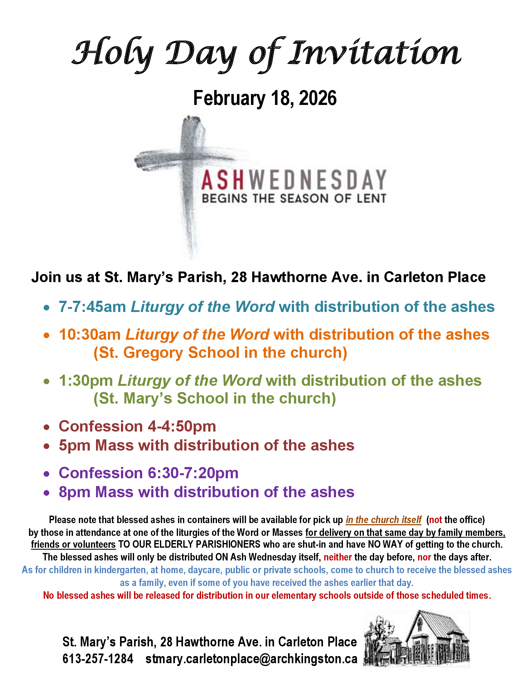 ** 2025 Tax receipts are available for pick up in the hallway** Weekday Masses are Monday, Tuesday, Thursday, Friday at 9:30am and Wednesday at 5pm. Sunday Masses are Saturday at 5pm and 8pm, Sunday at 9 and 11am.
